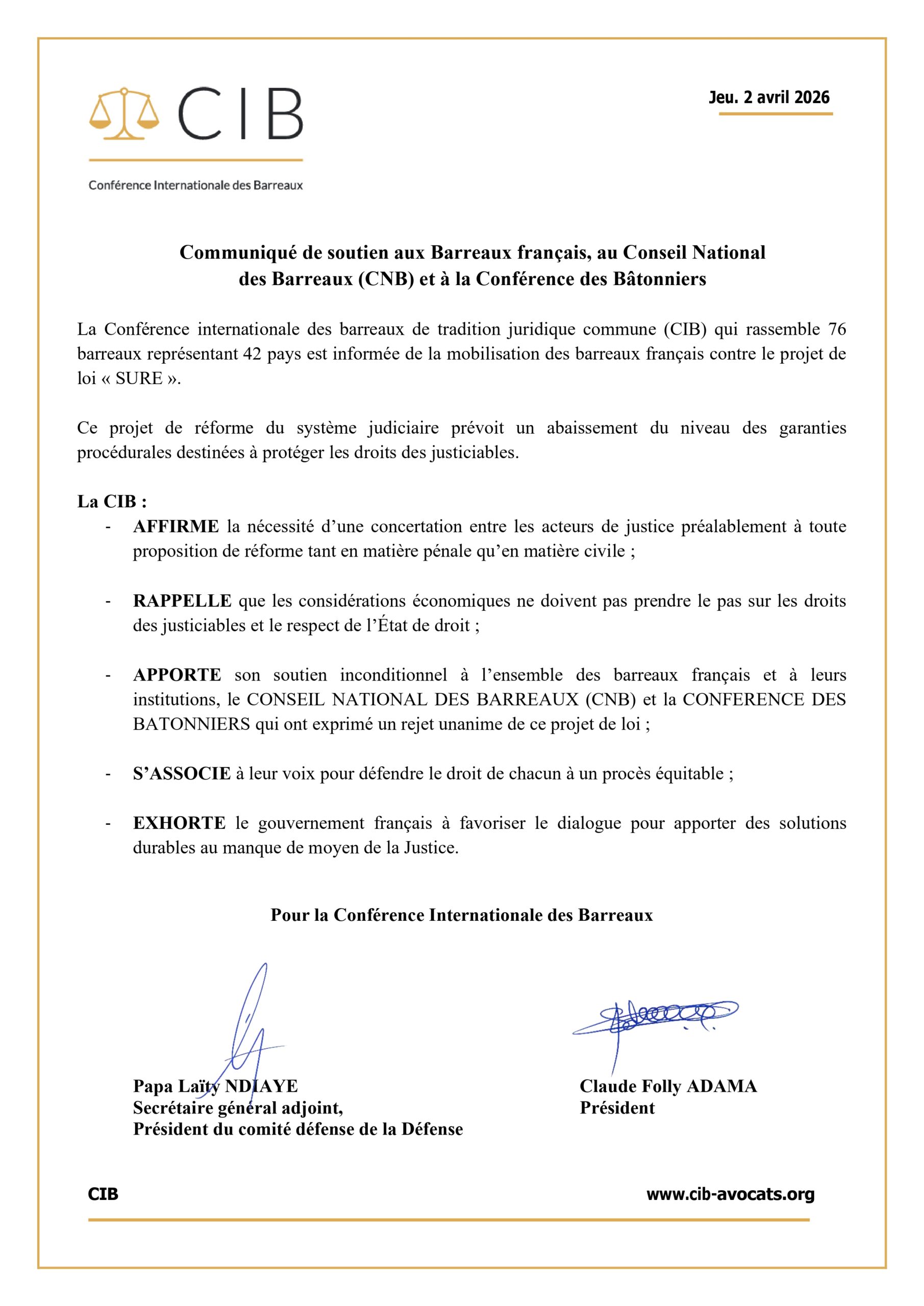 La Conférence internationale des barreaux de tradition juridique commune (CIB) qui rassemble 76 barreaux représentant 42 pays est informée de la mobilisation des barreaux français contre le projet de loi « SURE ».