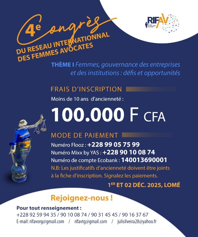 Le 4ème congrès du Réseau International des Femmes Avocates (RIFAV) se tiendra les 1er et 2 décembre 2025 à Lomé, au Togo, sous le thème « FEMMES, GOUVERNANCE DES ENTREPRISES ET DES INSTITUTIONS : DÉFIS ET OPPORTUNITÉS ». Cet événement majeur réunira des avocates et des expertes engagées pour promouvoir la place des femmes dans la gouvernance, en explorant les défis spécifiques qu’elles rencontrent ainsi que les opportunités à saisir dans les sphères des entreprises et des institutions.